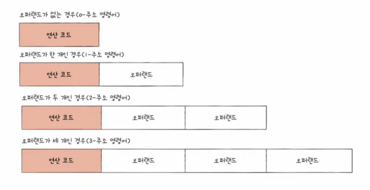 오퍼랜드 필드에는 레지스터가 담길 수도 있고, 메모리 주소 값이 담길 수도 있고 또는 직접적으로 명시해줄 수도 있다.