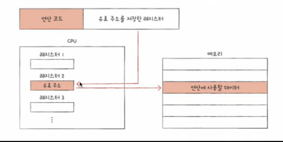 - 그 주소를 저장한 레지스터를 오퍼랜드 필드에 명시한다.