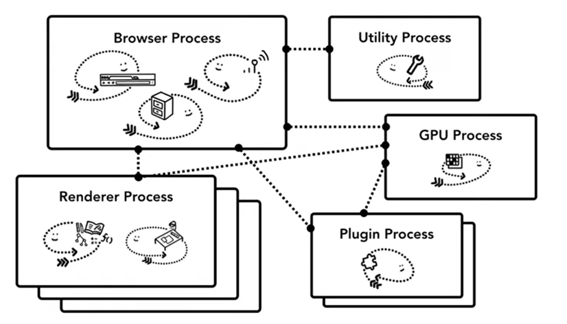 - Browser Process : 상단 탭구성, 앞뒤로 가기, 새로고침 아이콘 URL 입력창의 부분을 말한다.