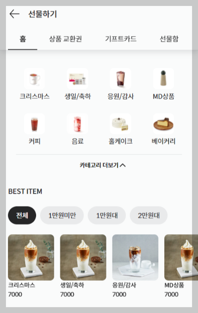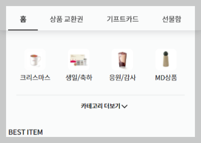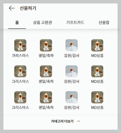 카테고리 더 보기가 접혀있을 때는 최소 아이템 4개를 보여주고, 더보기를 눌렀을 때 있는 아이템 갯수만큼 4개씩 배치된 리스트가 출력되는 형식의 모습이다. 데이터가 없는 상태라고 가정했을 때 하드코딩으로 리스트를 데이터에 넣어서 구현을 해봤다.