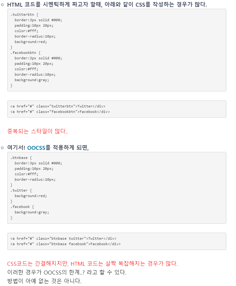 - Sass와 함께 사용하게 되면 단점을 보완할 수 있음[참고] OOCSS + Sass = OOSass (http://mytory.net/archives/8986/)CSS에서 OOCSS를 적용하는 것이 아니라,