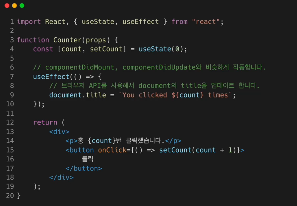 - useEffect() 함수만으로 생명주기함수와 동일한 기능을 수행할 수 있다.