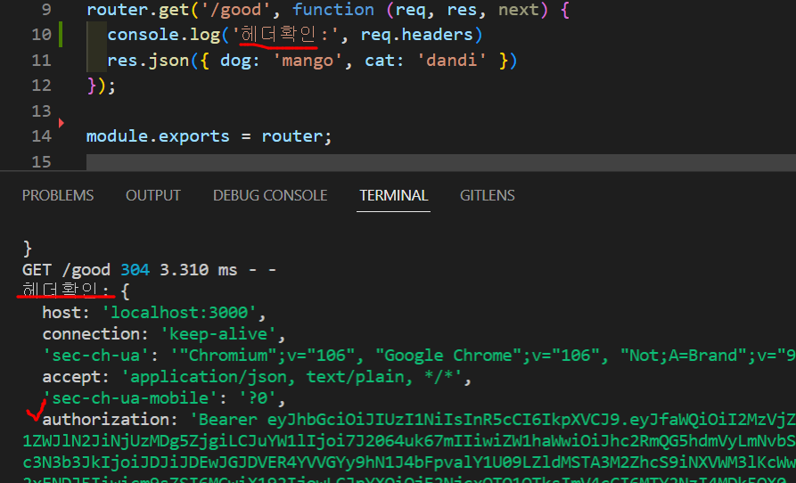 헤더에 제대로 인증이 나오는지 확인하기 위해서 test용 라우트에 header를 요청해보았다.