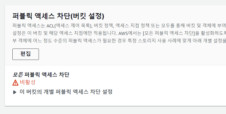편집 버튼을 눌러서 모든 퍼블릭 액세스 차단을 비활성화 해준다.
