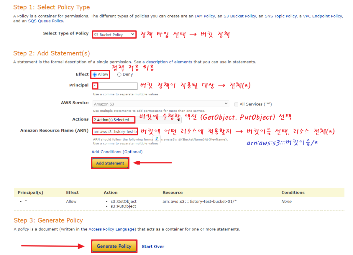 2. '버킷 정책' -> 정책 생성기 클릭
